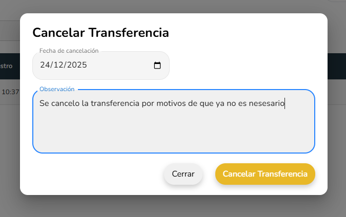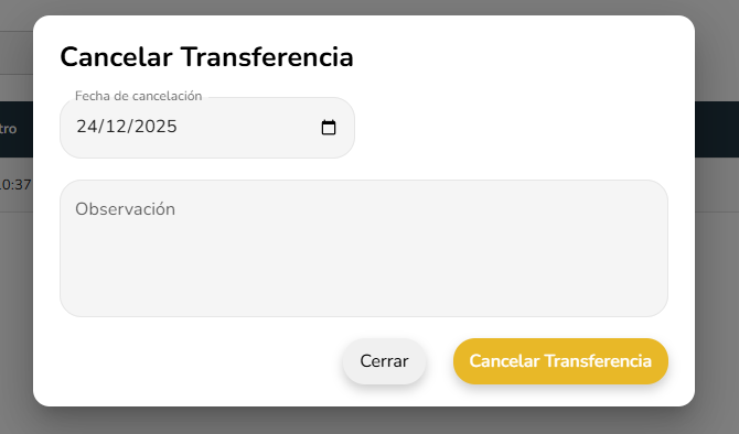 - Fecha de Cancelacion: Fecha en la cual se esta decidiendo cancelar la transferencia.