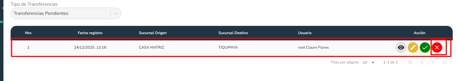 - Se hace click sobre el boton con icono de cancelar sobre una transferencia en especifico