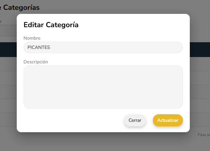 Tras registrar una categoria se puede permitir editar la informacion mostrada sobre una categoria mediante el boton icono de edicion que abre el mismo modal de registro pero con los datos seteados