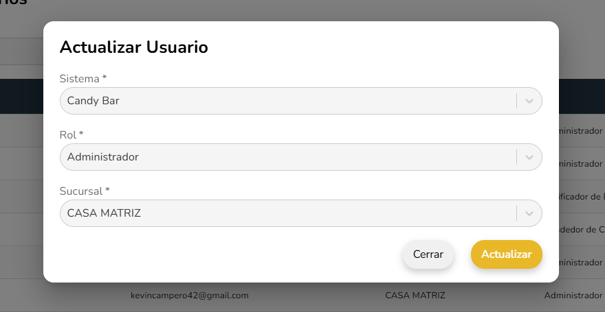 Tras tener un usuario registrado, podemos cambiar los roles, sistema y sucursal sobre dicho usuario