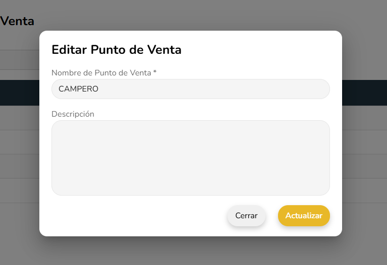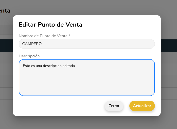 Tras registrar un Punto de Venta se puede permitir editar la informacion mostrada mediante el boton icono de edicion que abre el mismo modal de registro pero con los datos seteados.