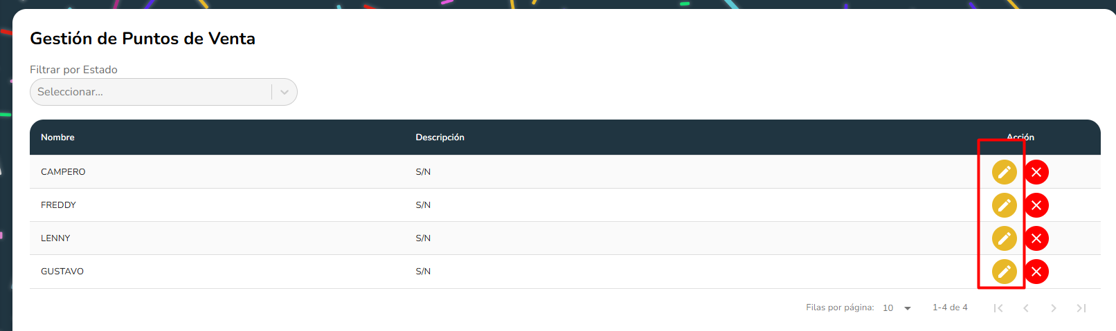 - Se hace click sobre el boton con icono de editar sobre un punto de venta en especifico