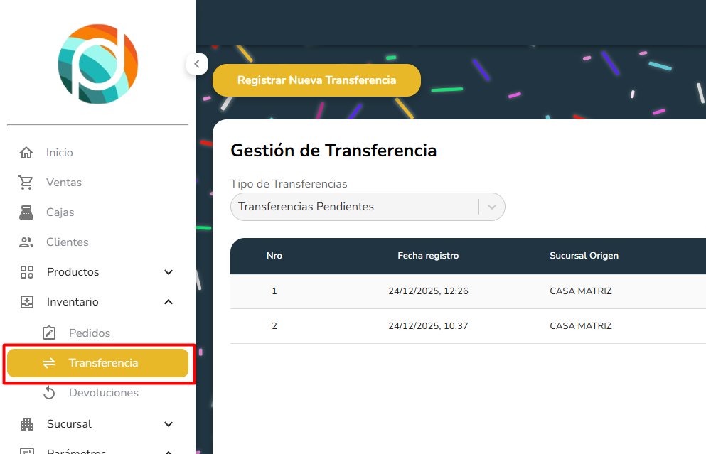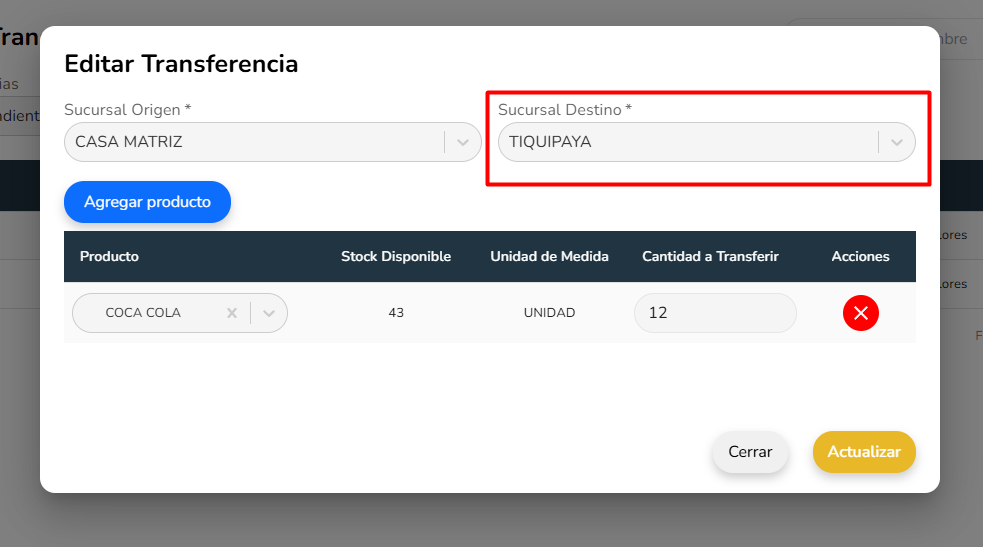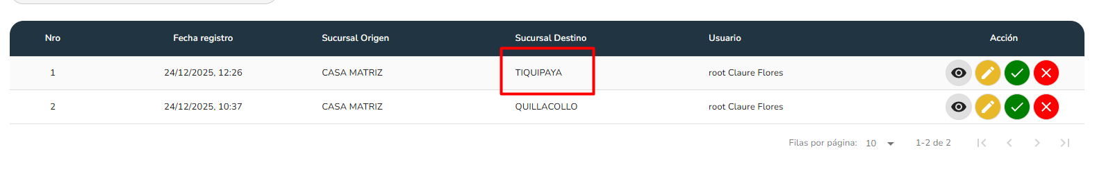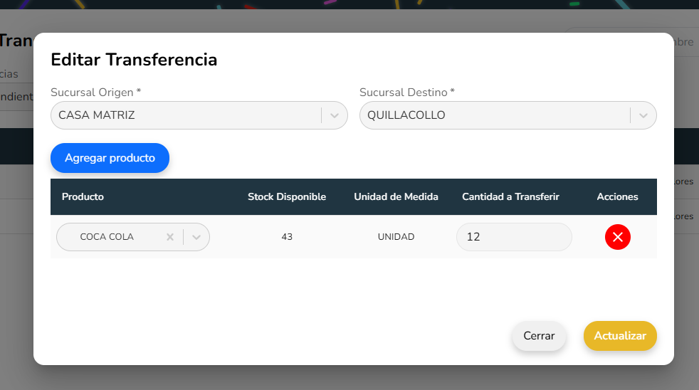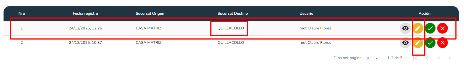 Tras registrar una transferencia se puede permitir editar la informacion mostrada mediante el boton icono de edicion que abre el mismo modal de registro pero con los datos seteados.