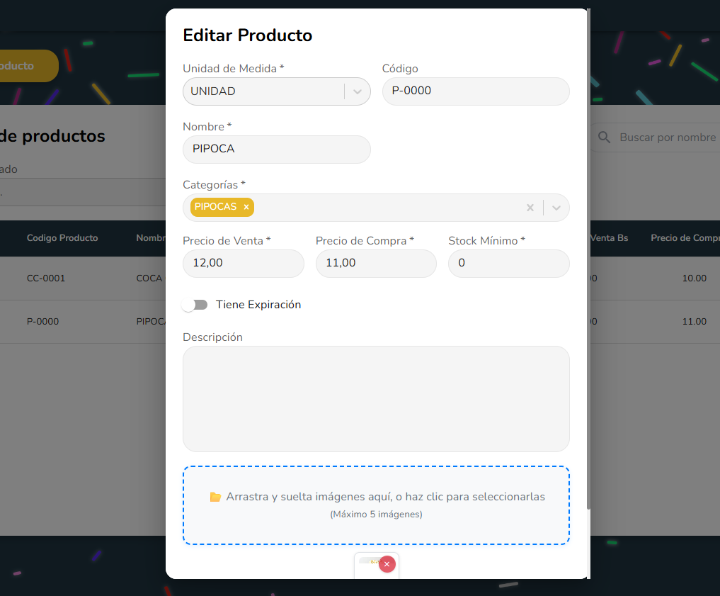 El formulario de edición es idéntico al de registro, con la diferencia de que los campos ya están precargados con la información actual del producto.