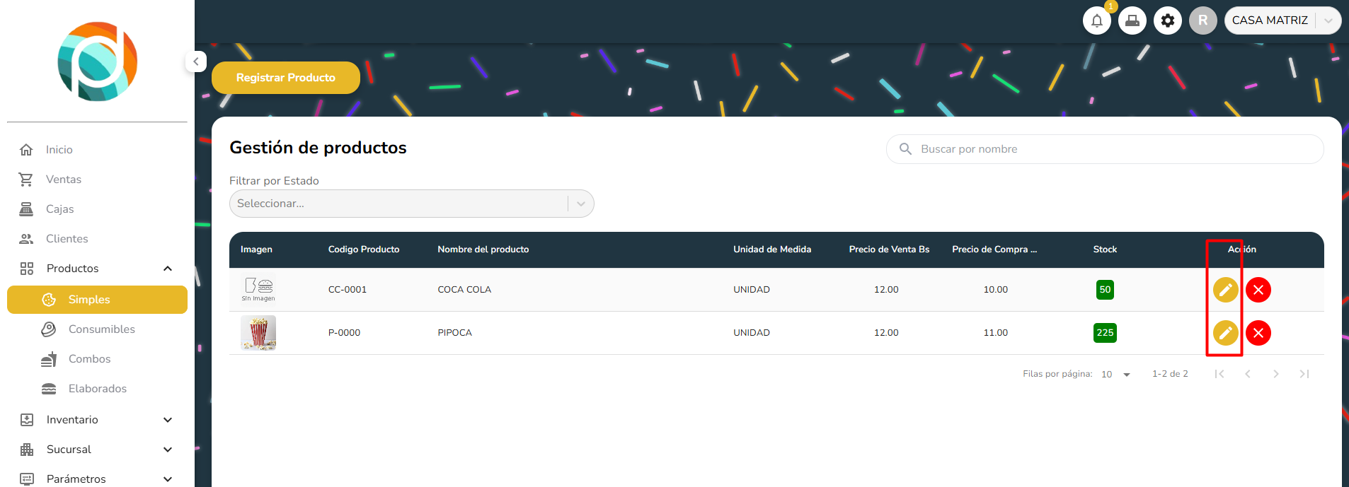 - A continuacion el usuario puede buscar el producto que quiera editar y debe hacer click sobre la columna de "Accion" en el boton con el icono de edicion eso abrira el formulario de edicion que es el mismo de registro sin el campo de stock.