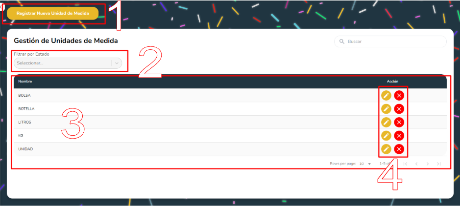 - Editar: Abre el modal de editar una Unidad de medida con los datos de dicha Unidad de medida precargada