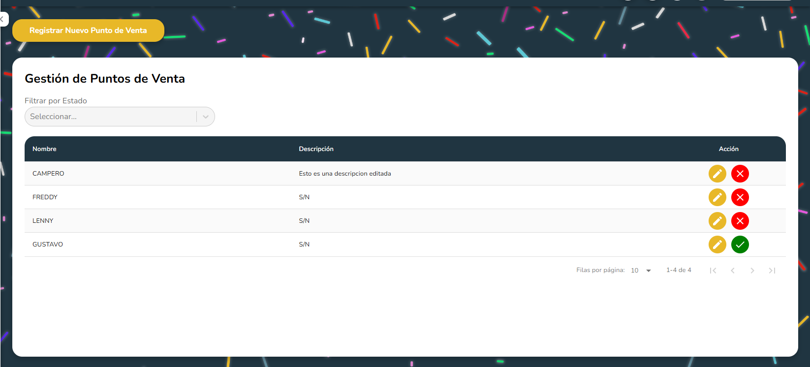 - Filtrador por Estado: Nos permite visualizar unicamente los puntos de ventas habilitados o inhabilitados.