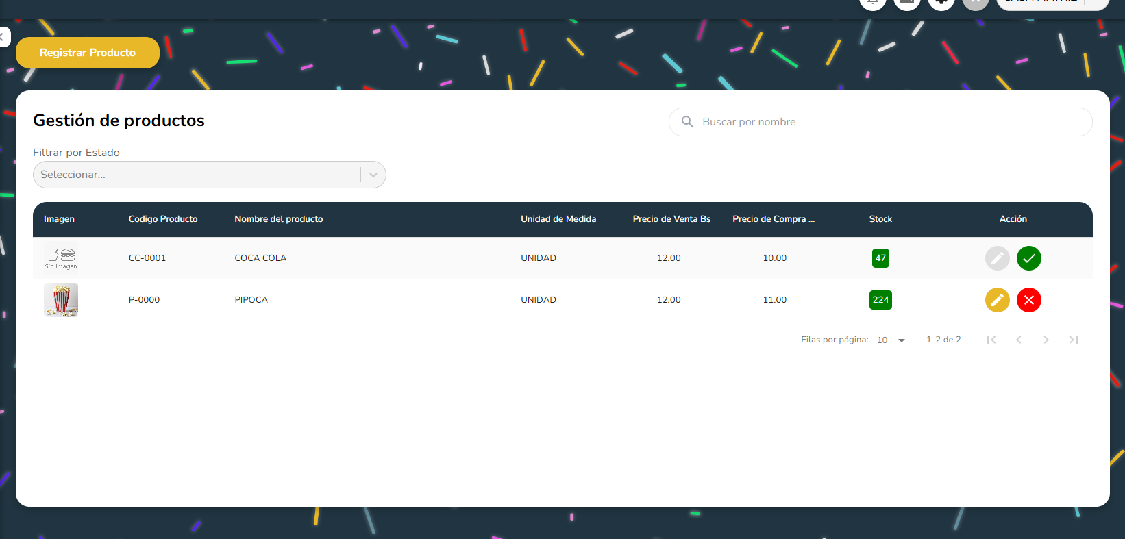 - Filtrador por Estado: Nos permite visualizar unicamente los productos habilitados, inhabilitados o todos
