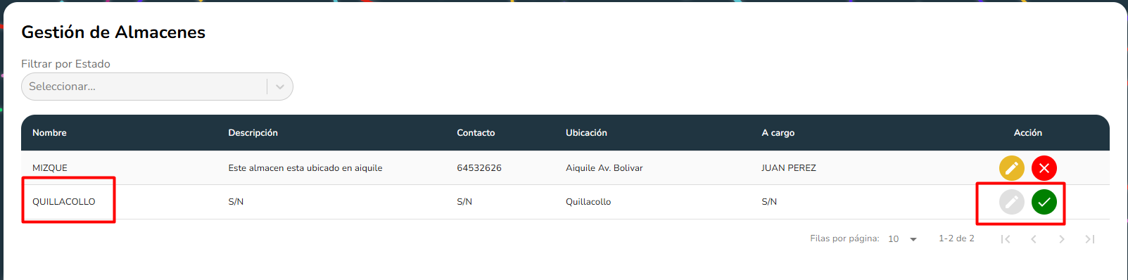 El inhabilitar o habilitar un almacen nos permite visualizar dichos almacenes donde estan siendo mostrados