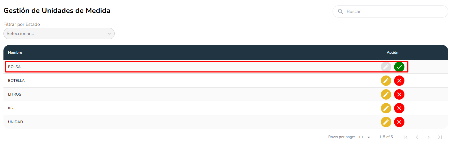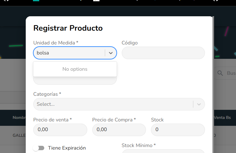 En el caso de la imagen se esta inhabilitando la unidad de medida "BOLSA" que a continuacion en el registro de un producto ya no esta visible