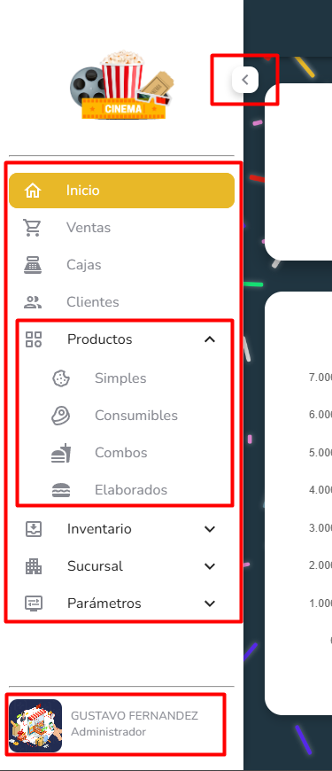 Como podemos ver en la imagen esta es la vista que se tiene sobre la pagina de Inicio desde la vista de Super Administrador y Administrador, mas adelante veremos la diferencia de vistas que hay entre el usuario Administrador/SuperAdmin con el vendedor de candybar.