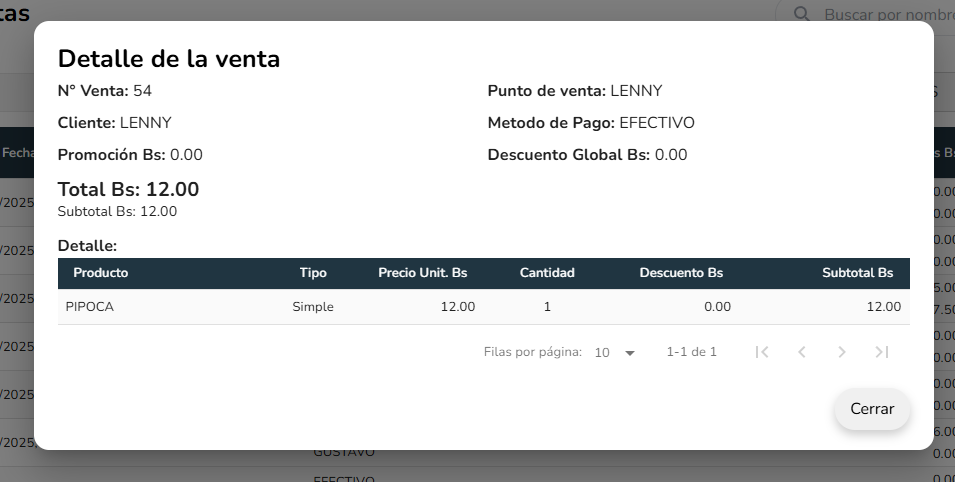 - Ver Detalles: Boton icono que abre el modal con los detalles sobre la venta Con este modal extra el usuario puede verificar todos los detalles de la venta realizada