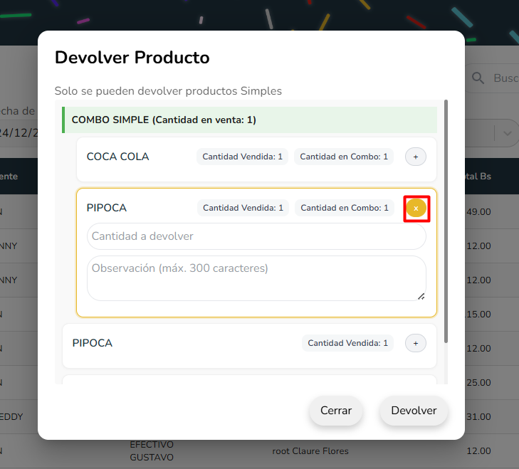 - Devolver Producto: Boton icono que abre el modal para poder registrar una devolucion a continuacion veremos mas detalles sobre esta funcionalidad