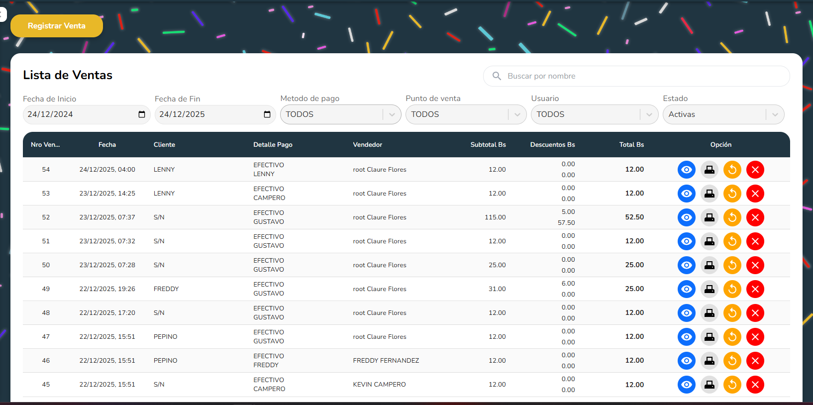 - Usuario: Por defecto en todos, permite filtrar todas las ventas realizadas por un usuario en especifico