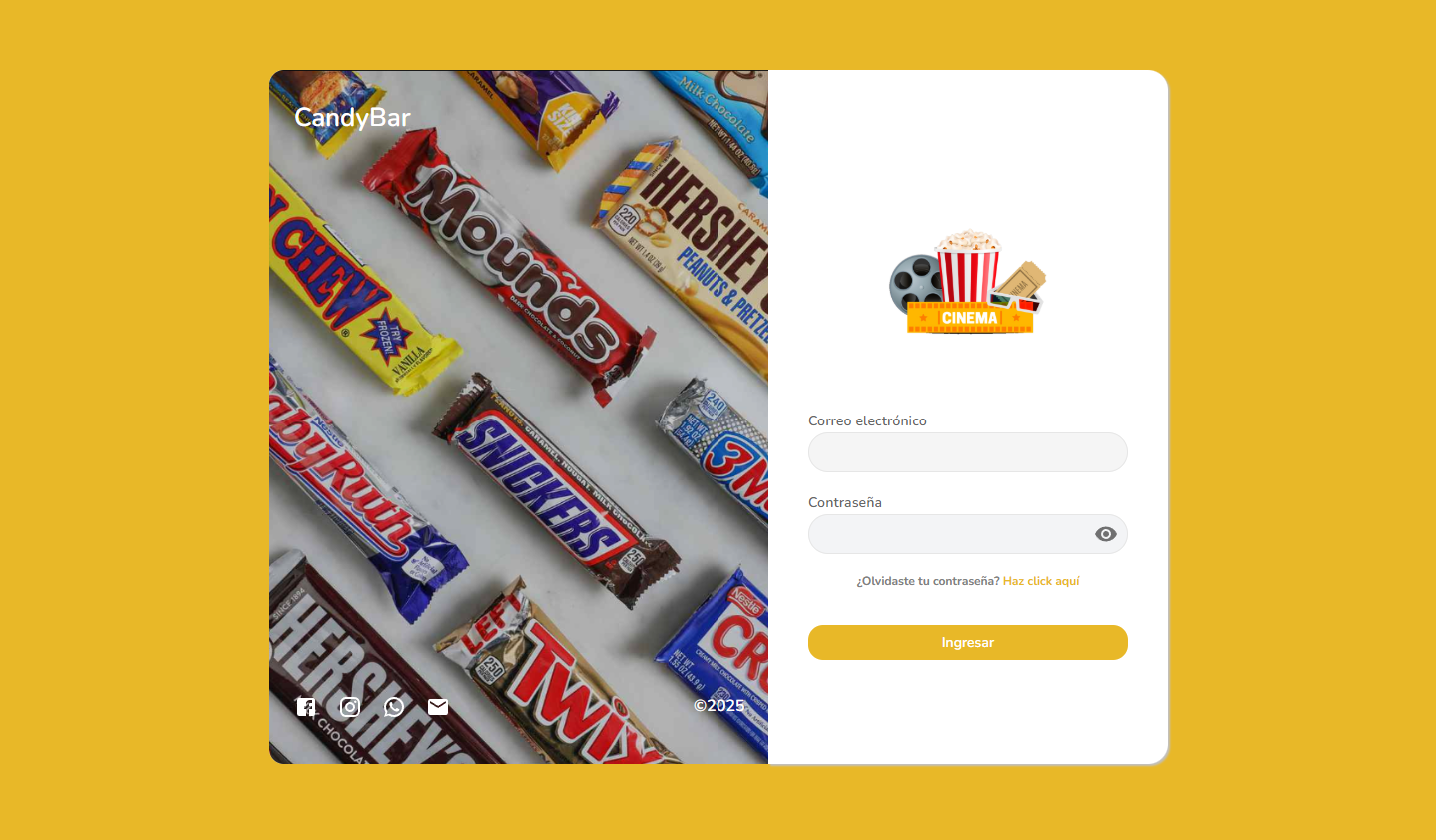 Es la página inicial del sistema donde los usuarios registrados pueden acceder utilizando sus credenciales. En este caso, deben ingresar su correo electrónico y contraseña para validar su identidad y entrar al sistema de Candybar. Esta sección es clave para garantizar la seguridad y el acceso controlado a la aplicación.