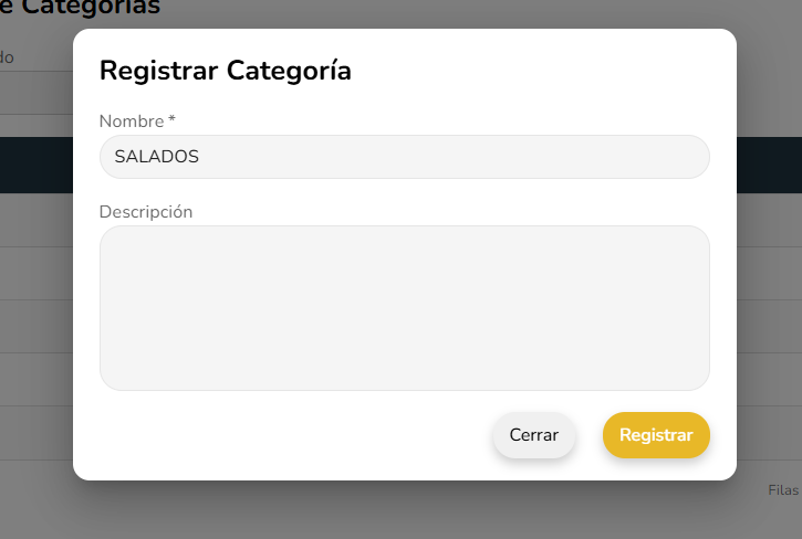 Este formulario permite registrar una nueva categoría ingresando su nombre y descripción, todo desde un modal rápido y accesible