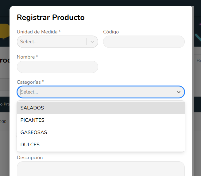 Una vez que se completa el registro de la categoría, esta pasa a estar disponible en el módulo de Productos , lo que permite asignarla directamente al crear un nuevo producto como se puede visualizar en la siguiente imagen