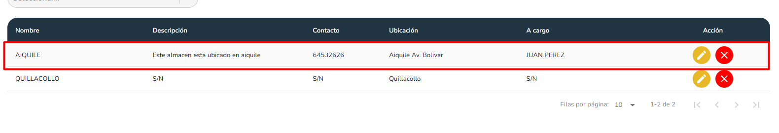 | Persona a cargo | No | Nombre del responsable del almacen |