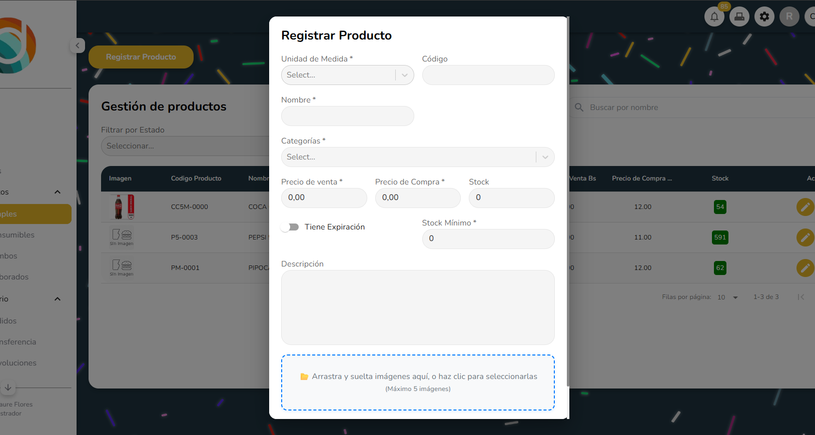El formulario de registro permite ingresar productos que forman parte del inventario. Puede tratarse de productos simples (que se venden directamente al cliente final) o consumibles (materias primas utilizadas para elaborar otros productos).