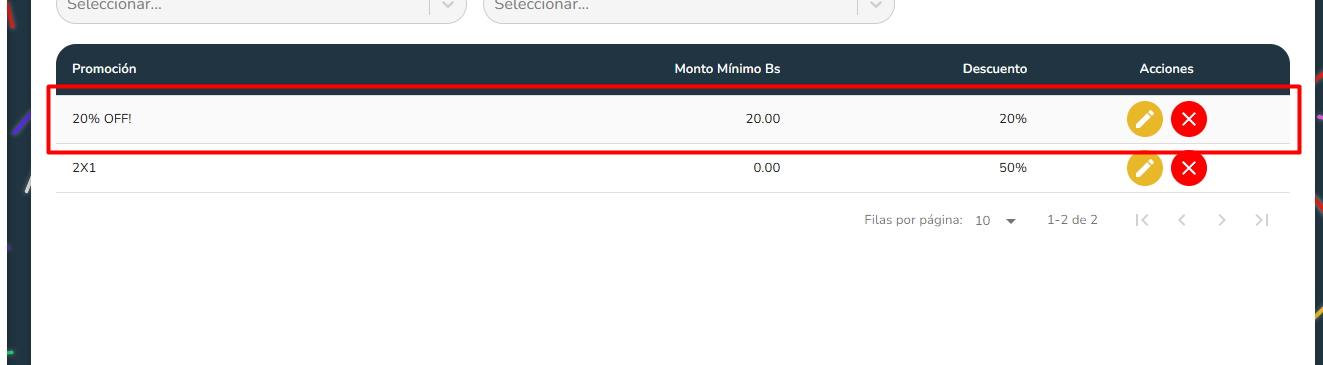 | Tipo de descuento | Si | Hay dos tipos de descuentos: Porcentaje(descuento en porcentaje sobre el subtotal) y Monto Fijo(Descuento en bs fijo) |