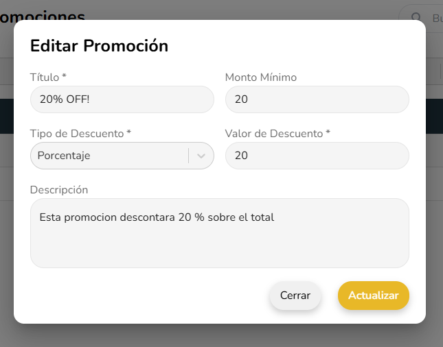 | Monto Minimo | Si | Valor minimo para aplicar la promocion sobre el subtotal de la venta |