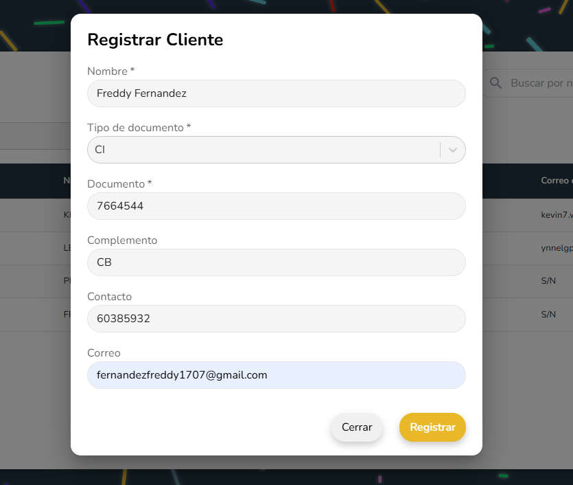 El registro de cliente permite ingresar los datos necesarios para identificar y vincular a una persona con las operaciones del sistema.