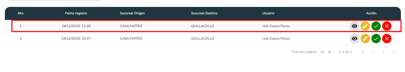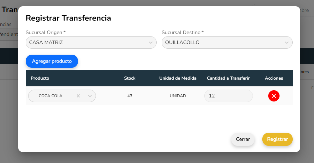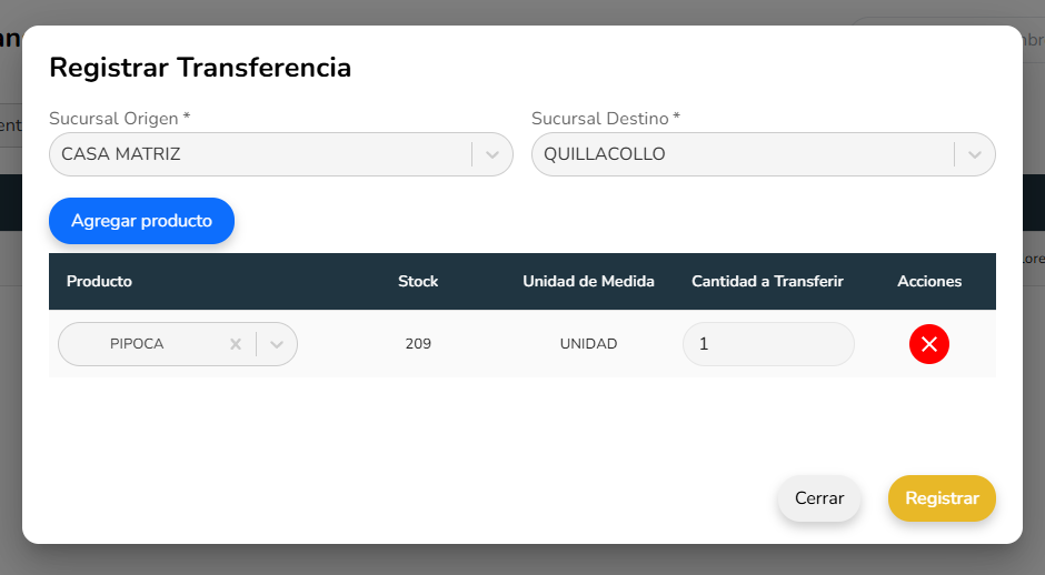 El registro de transferencia permite crear un movimiento de productos entre dos sucursales del sistema.