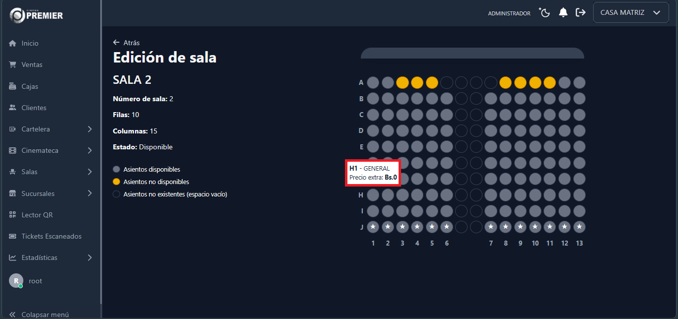 Cuando pasemos por encima de un asiento podremos ver su tipo y su precio extra si es un asiento 'GENERAL' o un asiento distinto.