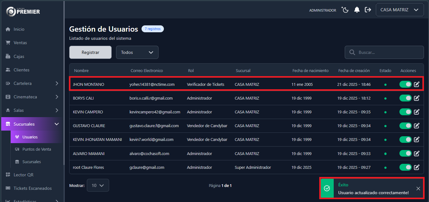 En las opciones tendremos una opcion para selecionar el rol en el sistema que se escogio en este caso se tienen los roles 'Administrador', 'Venderdor de Cine', y 'Verificador de Tickets'.