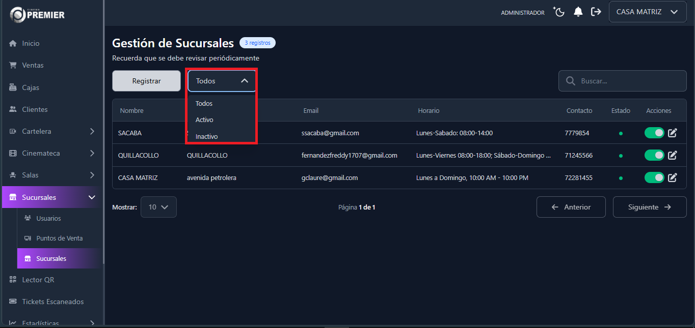 Se tiene el filtro para buscar por el estado del la sucursal.