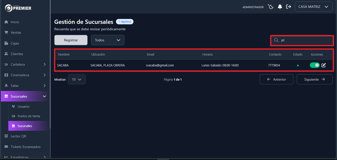 Se tiene el filtro para buscar por los atributos de la sucursal