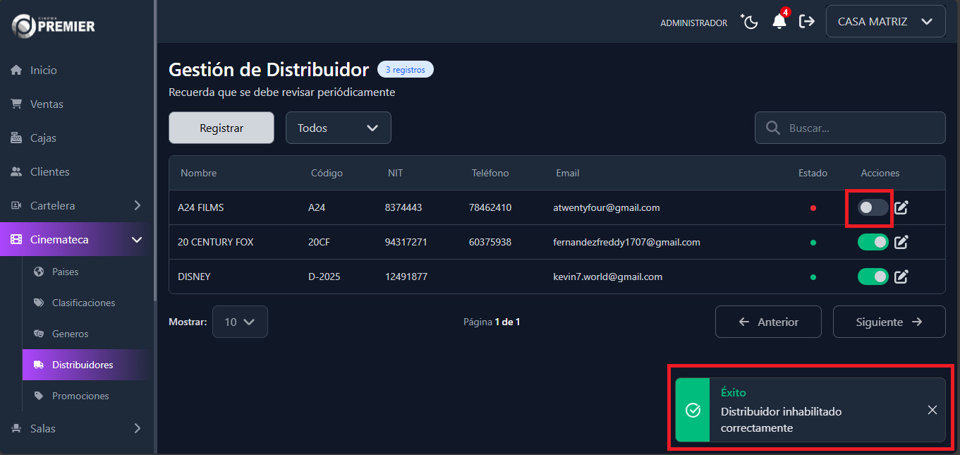 Como se puede ver en la Gestión de Película al registrar ya no muestra el distribuidor deshabilitado.