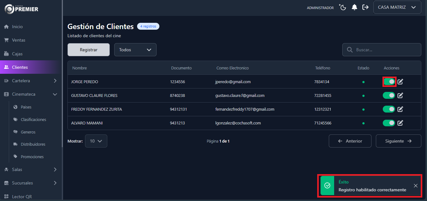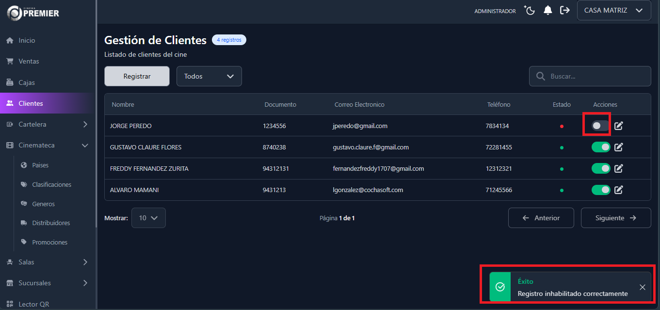 Como se puede ver en la Gestión de Ventas al registrar una venta y seleccionar al cliente ya no muestra al cliente deshabilidato.