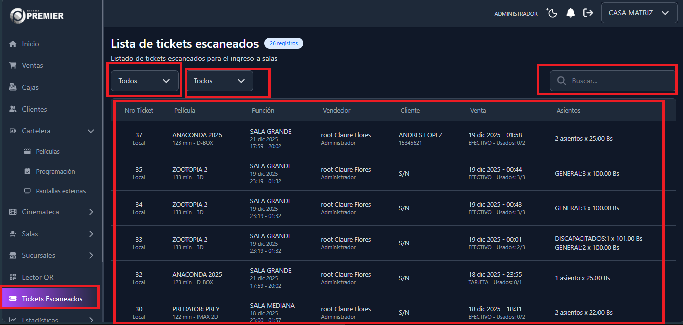 Cuando se vaya a la seccion de tickets escaneados se vera una lista asi como filtros para la busqueda dentro de la lista.
