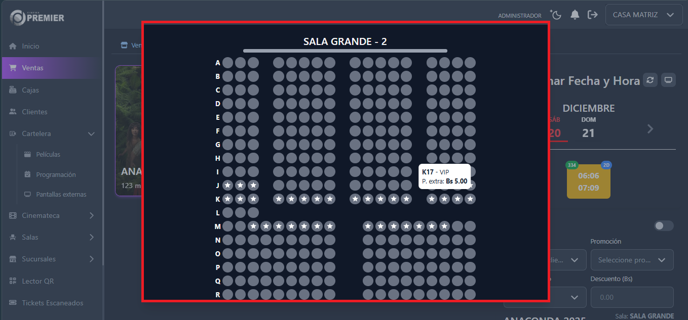 Para ver la programacion numerada necesitamos ir a la gestion de ventas luego escoger una pelicula y escoger la funcion del dia escogido.