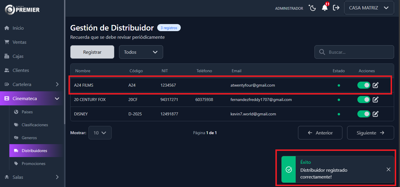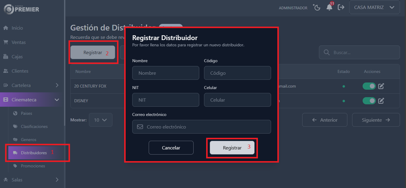 Se prosigue llenando el formulario con el nombre, codigo, NIT, y correo electronico del distribuido no es necesario el numero de celular al momento de registrar un distribucion.