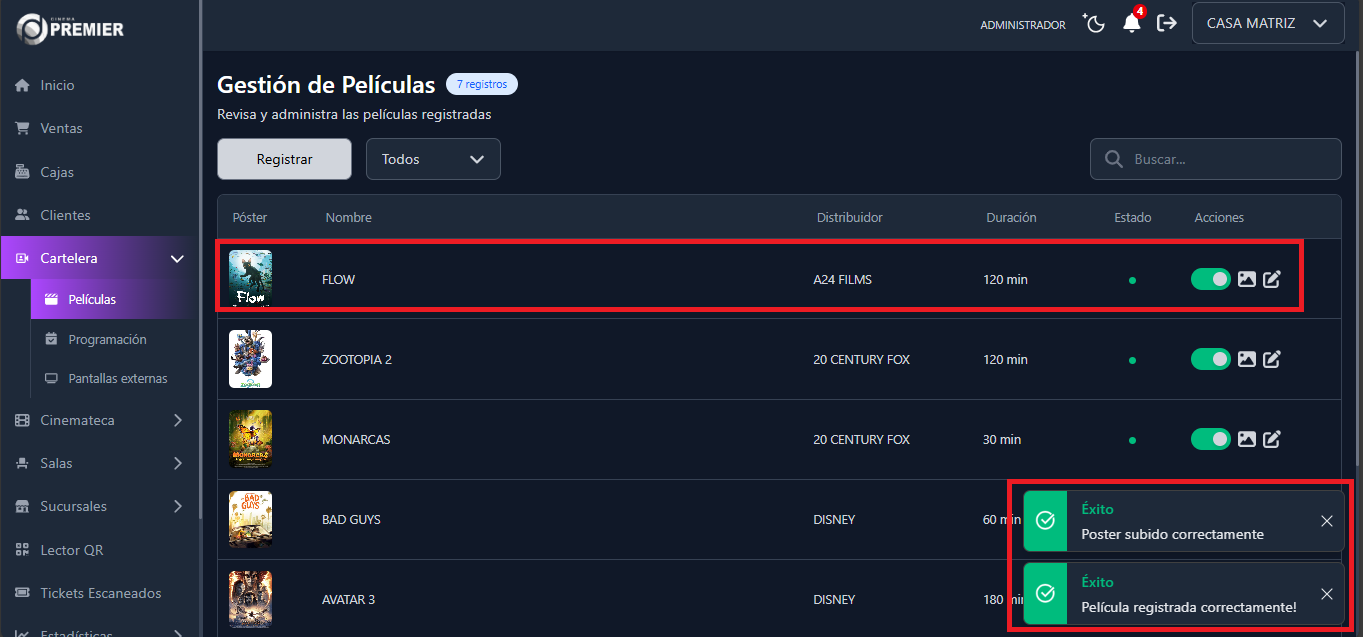 Se prosigue subiendo el poster de la pelicula y se registra la pelicula.