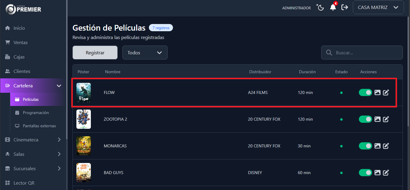 Los campos de nombre, direccion, fecha de estreno, URL del trailer, distribuidor, clasificacion, pais, generos, si esta en catalogo y la sinopsis son obligatorios hasta no llenarlos no se podra registrar.