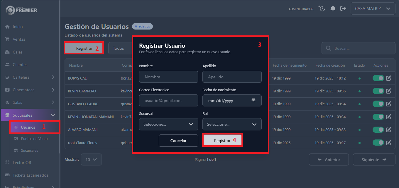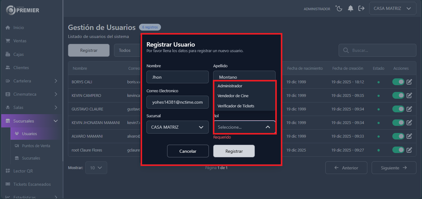 En el formulario de registro de usuario tendremos se tendra la opcion para elegir en que rol tendra el usuario en la administracion del cinema.