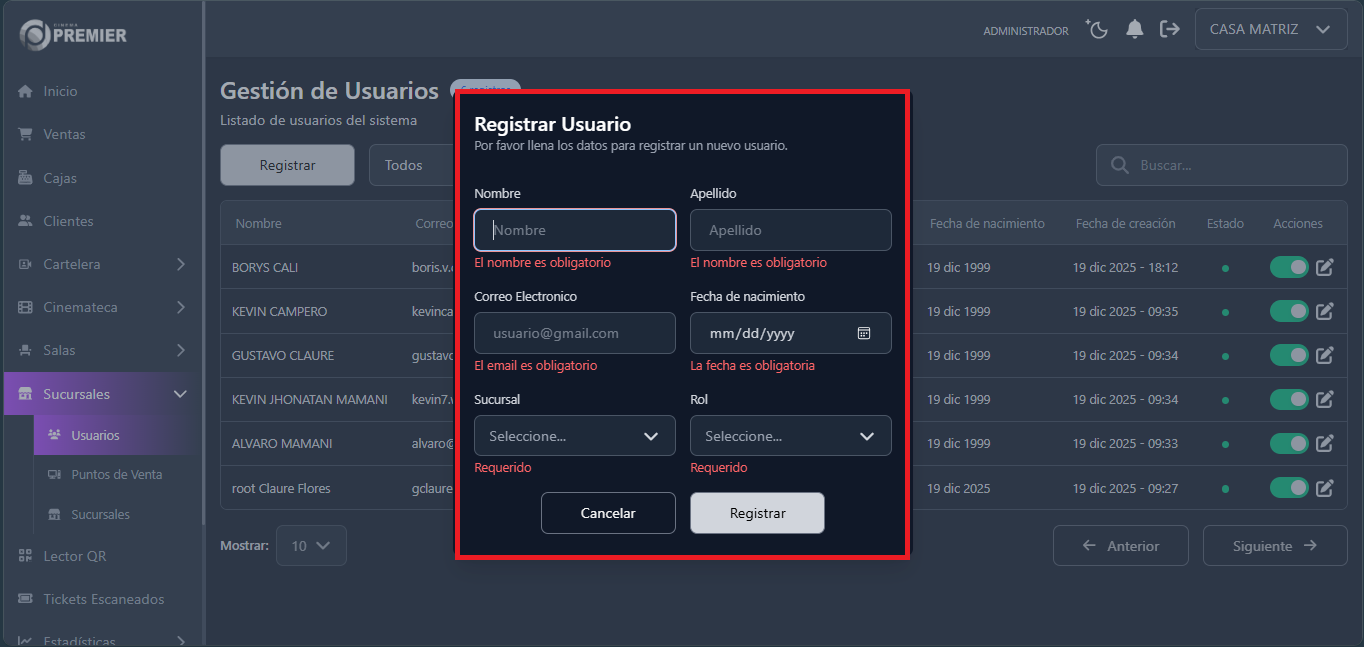 Los siguientes campos son requeridos para el registro de usuario colaborador del cinema.