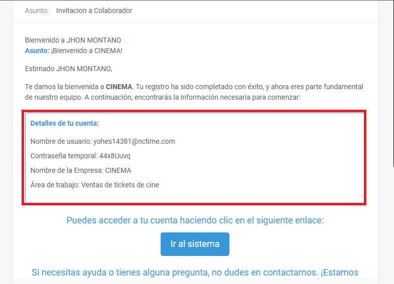 Ya con eso se observa el registro creado, llegara un correo al al correo del usuario colaborador con el que se hizo el registro con las credenciales para el usuario.