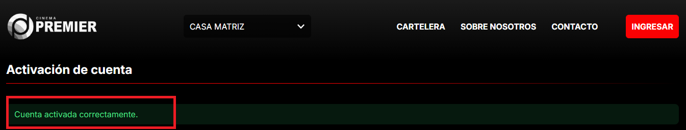 Al ingresar al correo recibido en su bandeja de entrada, encontrará un mensaje con un botón de activación. Al hacer clic en dicho botón, será redireccionado automáticamente a una nueva ventana correspondiente al cliente del sistema de cine.