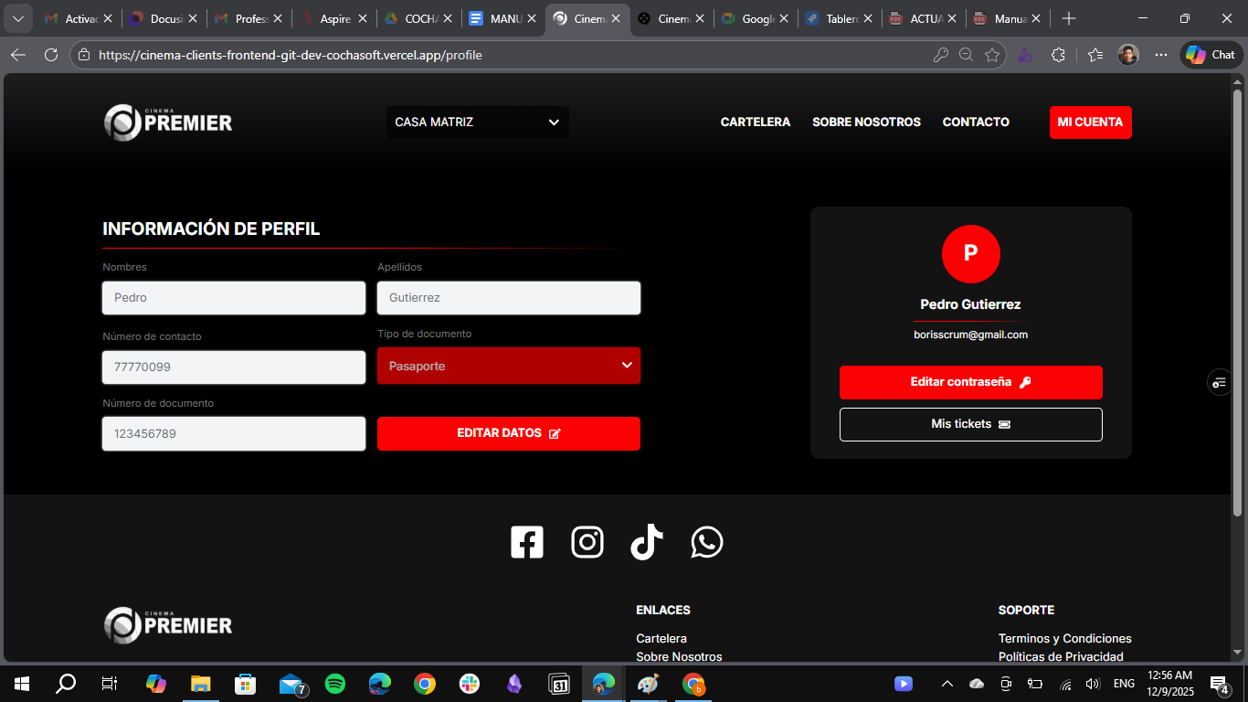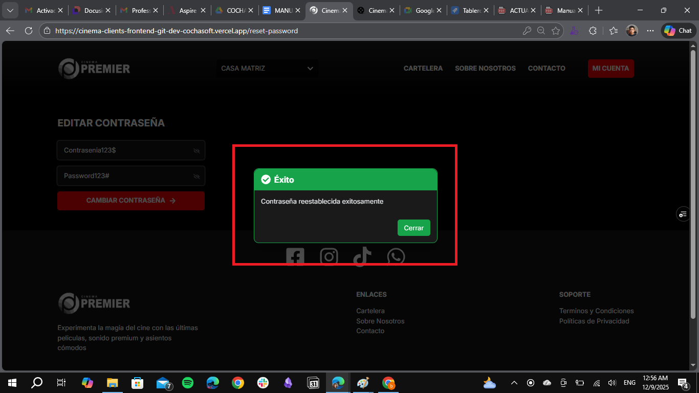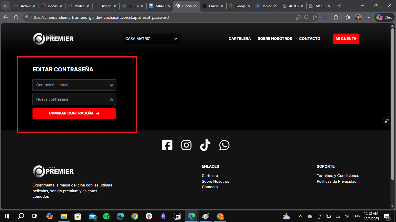 Una vez ingresados los datos, haga clic en el botón “Cambiar Contraseña”. El sistema mostrará un mensaje confirmando que el cambio fue exitoso y lo redirigirá automáticamente a la sección de Perfil, donde podrá continuar utilizando su cuenta con normalidad.