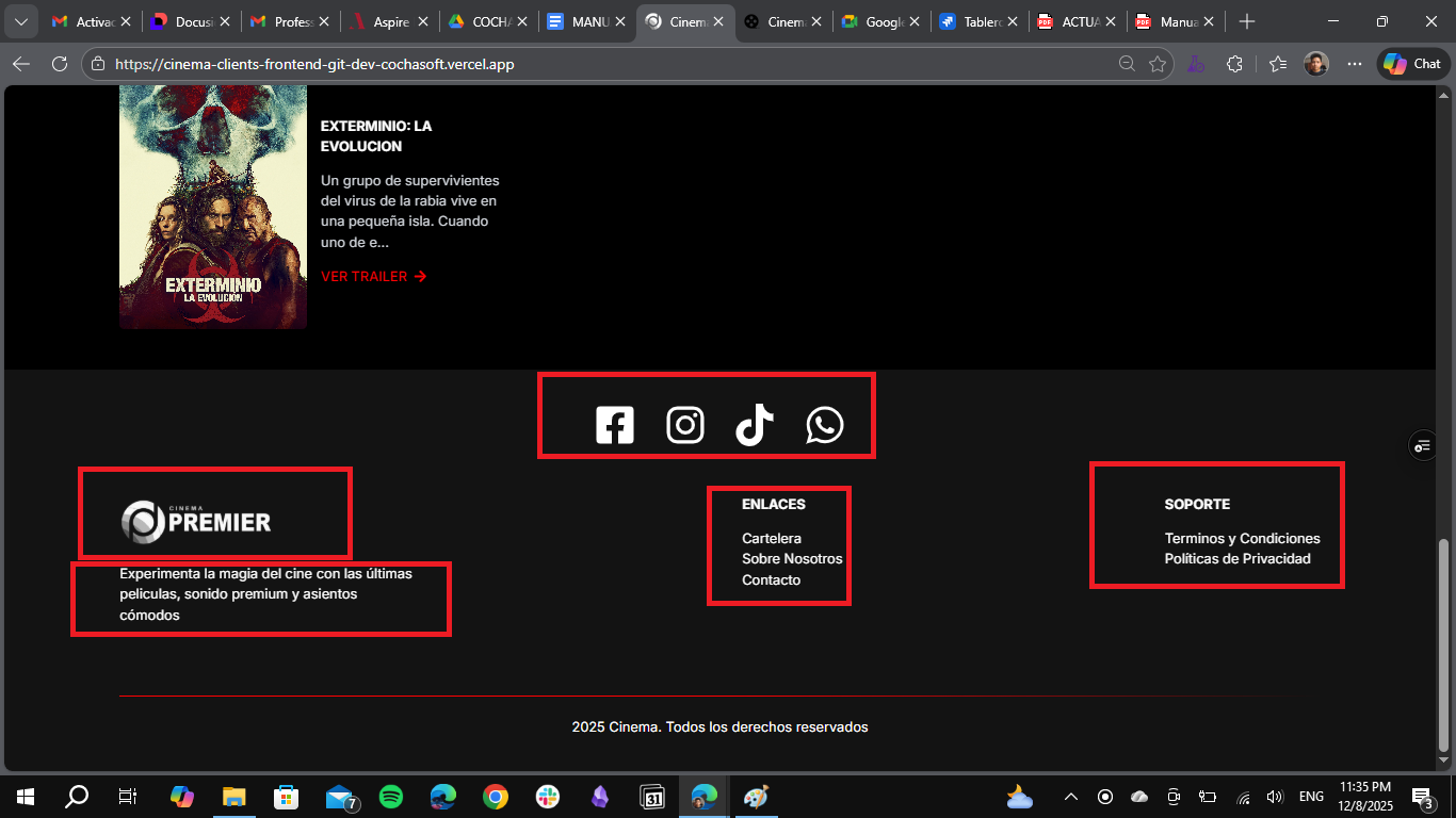 Redes sociales: en la parte superior verás los íconos de las distintas redes sociales. Al seleccionarlos, se abrirá una nueva ventana con la página oficial del cine en esa red.
